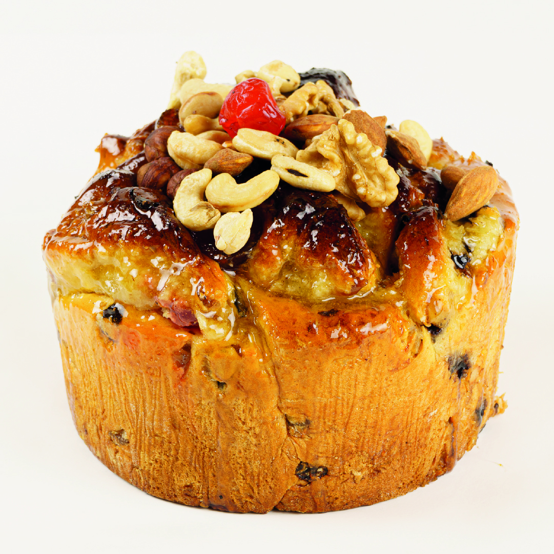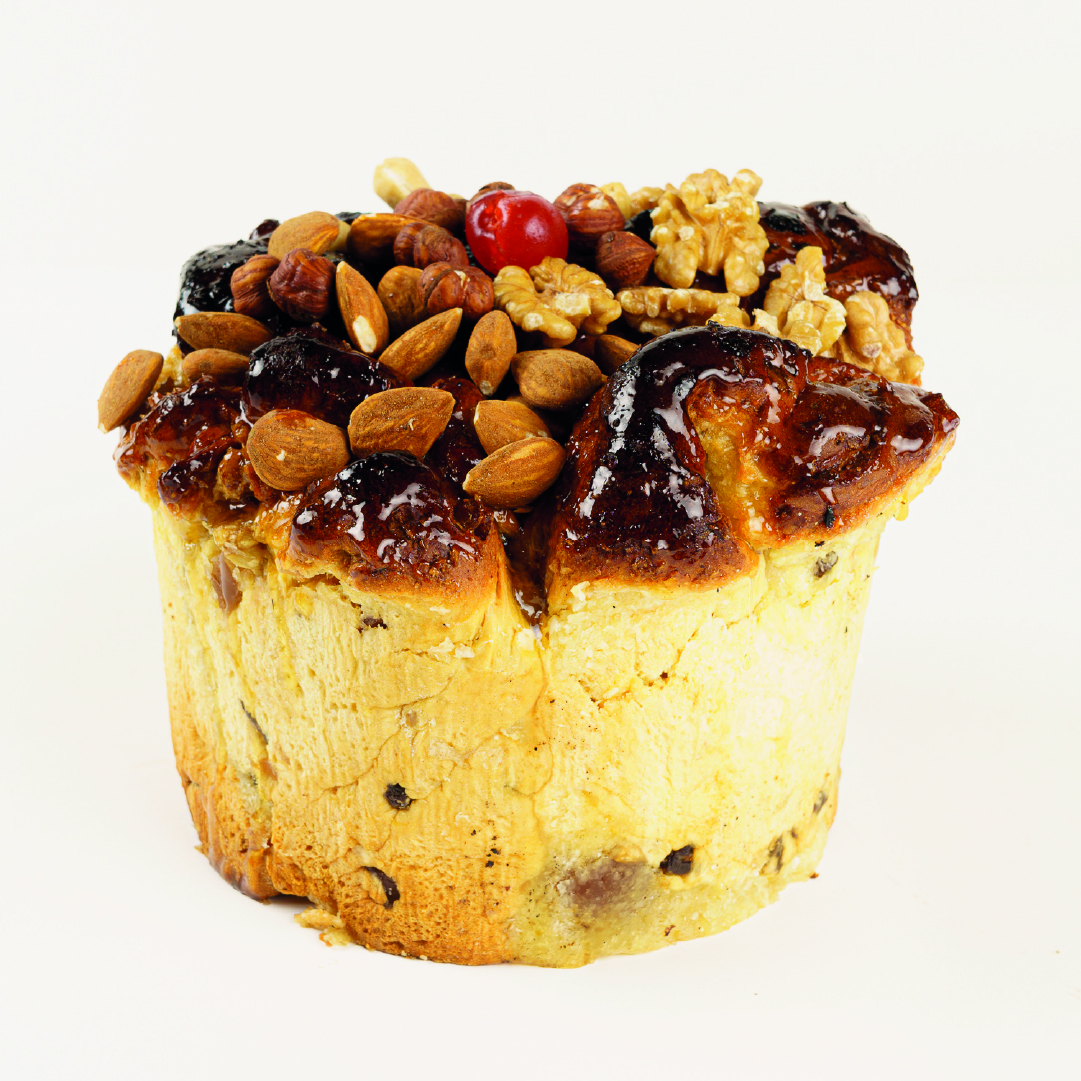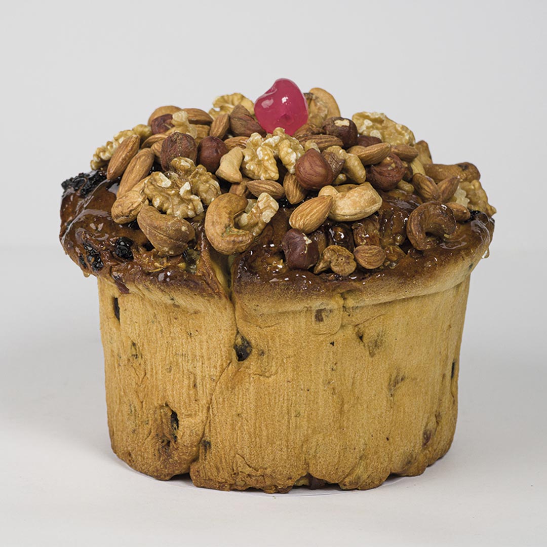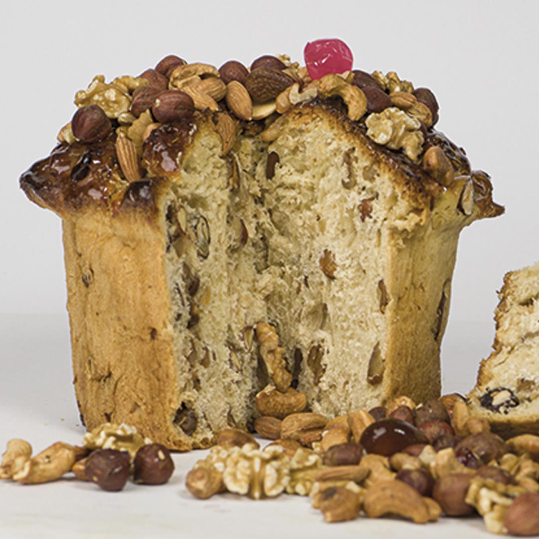 90% frutos secos, y 10 % frutas confitadas y pasas de uva.